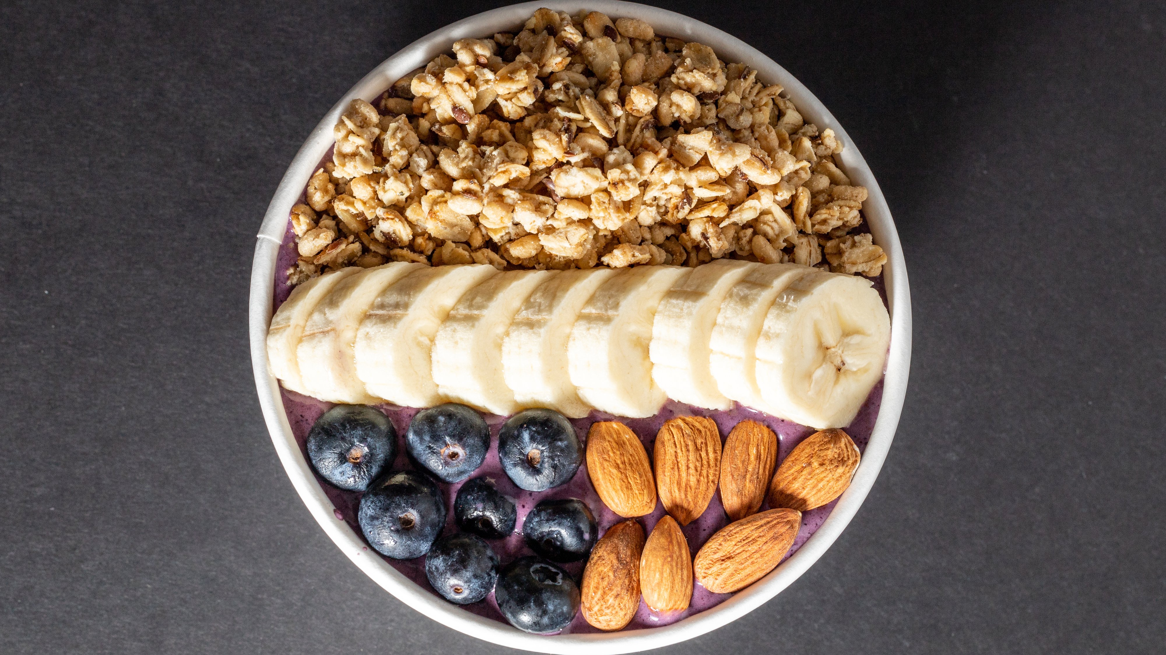 Coconut milk, blueberry, raspberry, strawberry, powdered PB, and your choice of protein.Superfood Açaí Smoothie