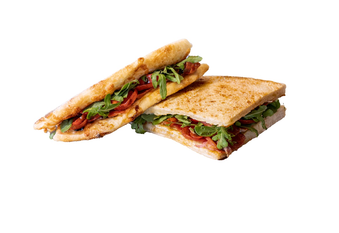 WISE GUY - Packed with meaty goodness and a ton of swagger. Mozzarella Cheese, Olive Oil, Calabrese Salami Cup and Char Pepperoni, Copa, Roasted Red Peppers, Arugula drizzled with Balsamic Glaze, Served with a side of La Bomba SauceCLUCK’IN CAESAR