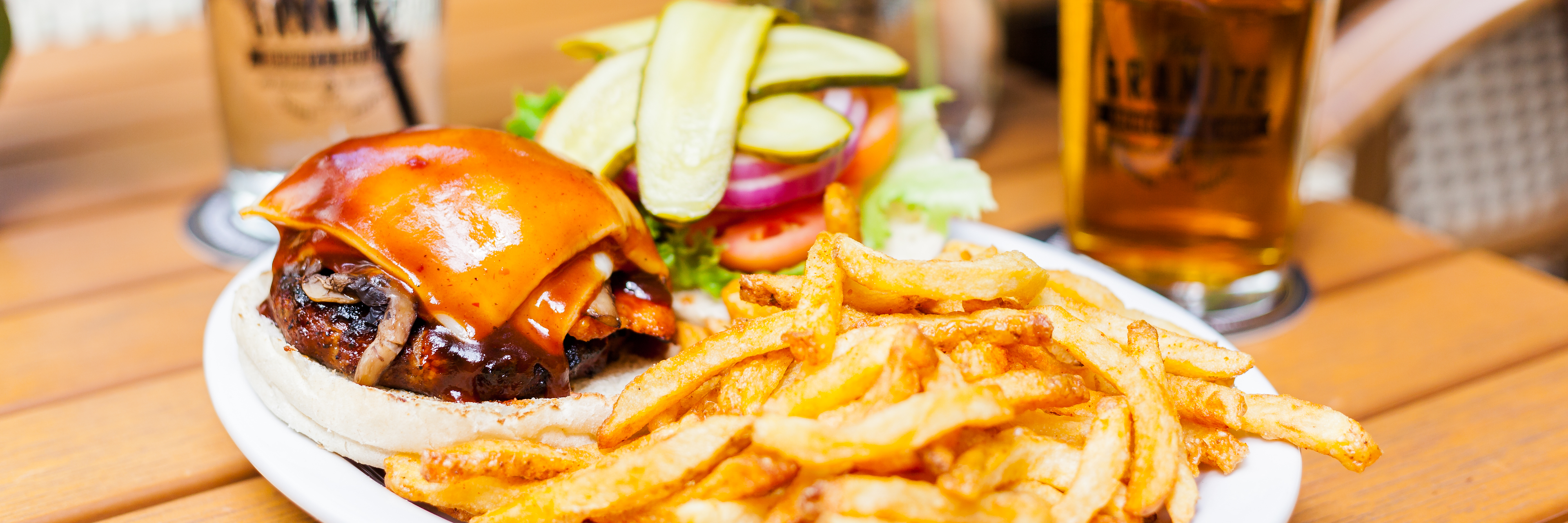 Our Granite burger brushed with our famous Stout BBQ sauce & topped with sauteed mushrooms, Jack cheese & peameal bacon on a Kaiser bun. Served with your choice of hand cut fries or veggie sticks.$21.95