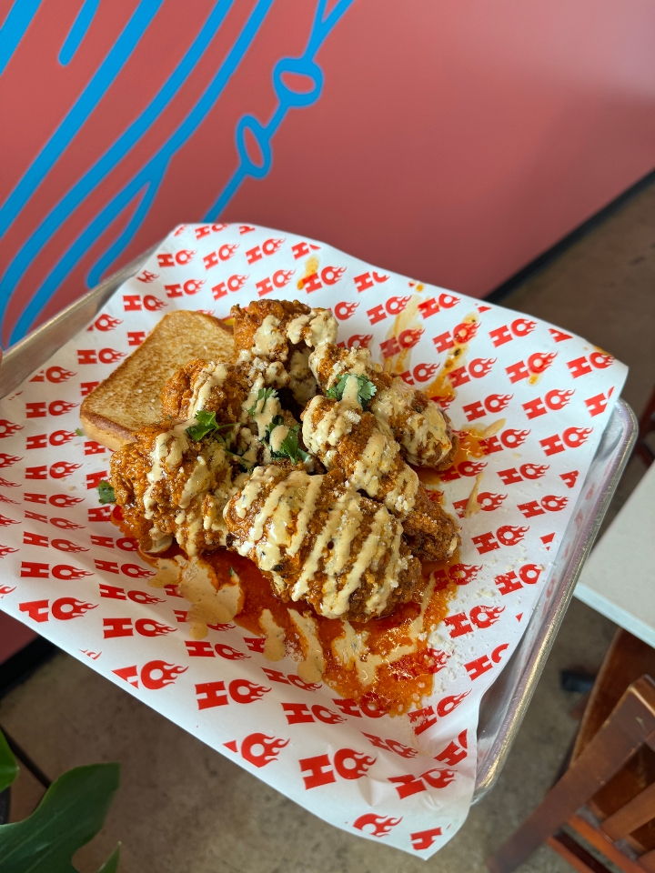 Hot Honey Butter Drizzle. 3 Cheese Sauce Drizzle. Alabama White Sauce Drizze. Fresh Cilantro Leaves. JUMBO HOT TENDER ON TOP! Let's cheat, baby!$12.00