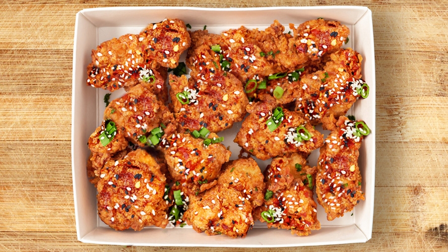 5 Chicken Fingers topped with Buffalo Balsamic Maple, Buttermilk Baby Ranch and fresh parsley w/shredded carrots on the side7pc General Sticky Chicken Poppers
