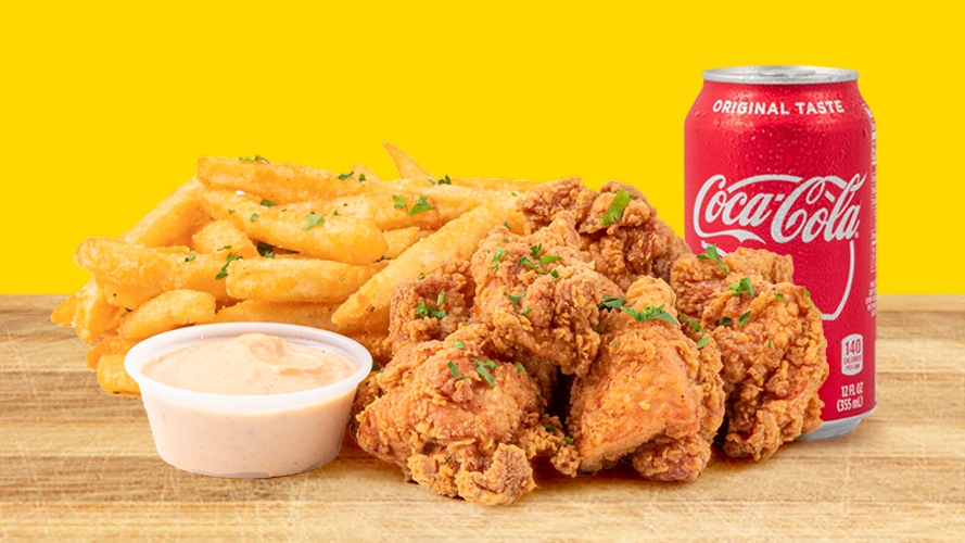 7 bite-sized Chicken Poppers with your choice of one sauce, classic or cajun fries, and a canned drink12pc Chicken Popper Combo