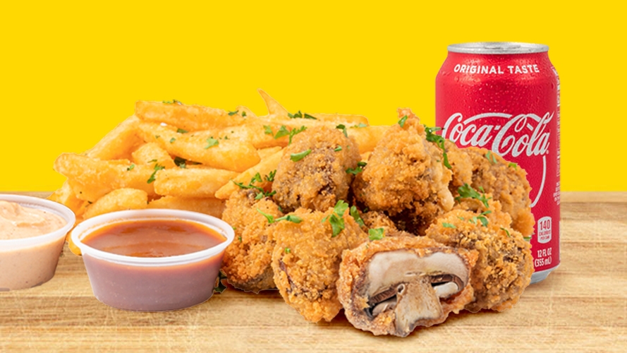 12 bite-sized Chicken Poppers with your choice of two sauces, classic or cajun fries, and a canned drink7pc Mushroom Popper Combo